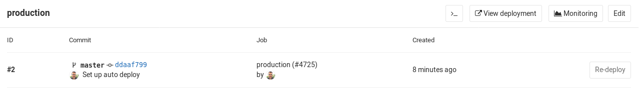.gitlab-ci.ymlis properly configured will show up in the "Environment" and "Last deployment" lists.